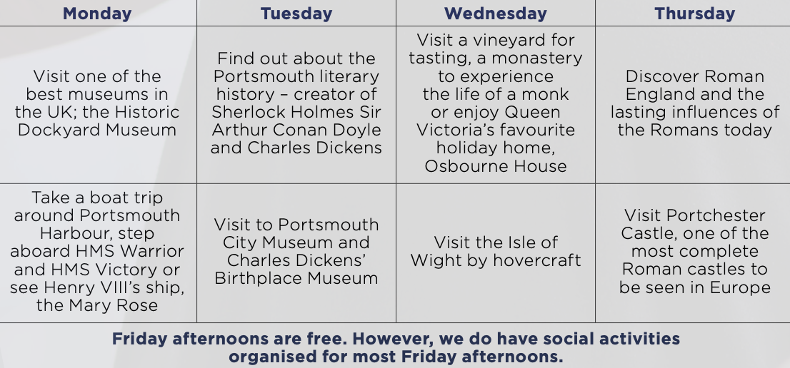 Portsmouth è facilmente raggiungibile da Londra e offre un ricco programma sociale: musei, luoghi storici, percorsi letterari, il celebre porto storico e tante altre attività per vivere al massimo il tuo soggiorno 🌟. Per l’alloggio potrai scegliere tra homestay di qualità, residence self-catering e altre soluzioni comode e vicine alla scuola.