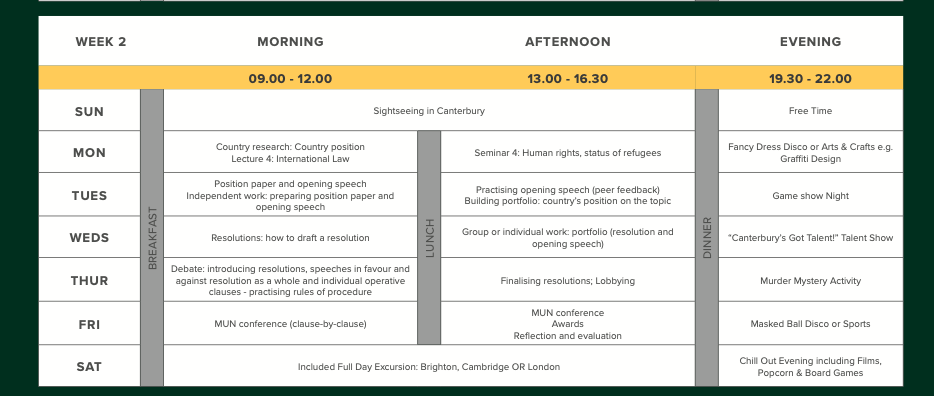“Per gli studenti interessati alle relazioni internazionali con la curiosità e il coraggio di sfidare ed essere sfidati! Il corso culmina in una conferenza simulata delle Nazioni Unite in cui gli studenti assumono il ruolo di delegati degli Stati membri e discutono soluzioni a problemi attuali”.