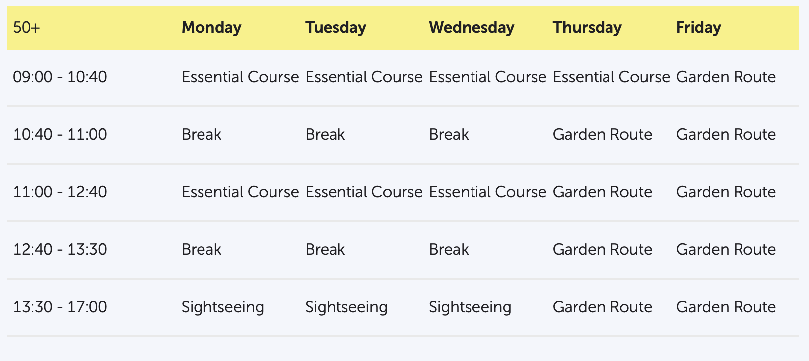 Gli studenti 50+ seguono il corso di inglese insieme ad altri studenti della scuola (di età diverse), ma il programma pomeridiano e di weekend è dedicato esclusivamente al gruppo 50+.